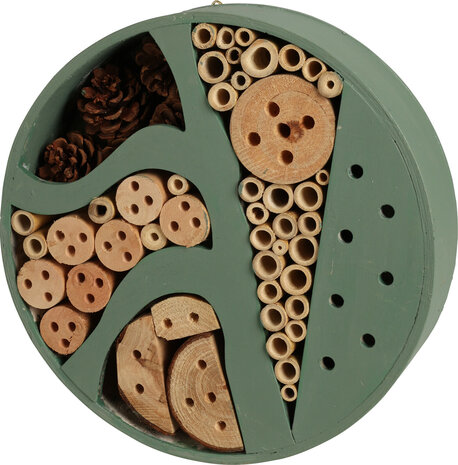 Het insectenhuis is vervaardigd uit een mix van multiplex, vurenhout, bamboe en dennenappel, zorgvuldig ingedeeld in verschillende compartimenten. Deze variatie aan materialen en structuren zorgt voor optimale aantrekkingskracht voor verschillende insectensoorten.