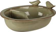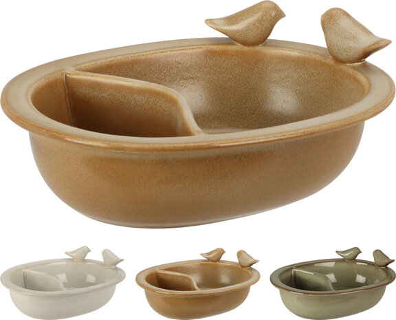 Deze elegante porseleinen vogel drinkschaal en voederbak is een stijlvolle en praktische toevoeging aan tuin, balkon of terras. De schaal is verdeeld in twee compartimenten, waardoor je eenvoudig water en vogelvoer kunt aanbieden in één product. Op de rand zitten twee decoratieve vogelfiguurtjes, die zorgen voor een speels en sfeervol accent.