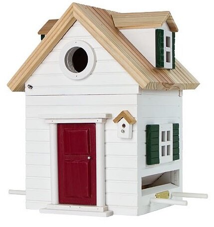 Ik heb een aantal van dit soort huisjes aan mijn schutting gehangen, tussen de struiken en bomen in mijn tuin. Het geeft een heel vrolijk gezicht en we zien er zo nu en dan ook een koolmeesje of musje naar binnen gaan.