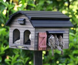 De voerdispencers bieden een goede bescherming tegen sneeuw en regen. Bovendien zitten de kleine tuinvogels droog. De voederschuur bevat een grote voercontainer en hoeft niet steeds bijgevuld te worden. De keren dat bijvullen nodig is, is het een kwestie van enkel het dak oplichten en het voederhuis te vullen. Ook reinigen is eenvoudig en het risico op ziektes/besmetting tussen vogels is klein gezien het feit dat de vogel uitwerpselen op de grond vallen en niet op de voederplank. Plaats de voederschuur op een paal in de tuin. Montageplaat en schroeven zijn bijgesloten in de verpakking samen met een montagehandleiding.