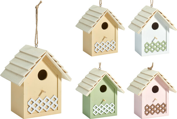 Decoratief vogelhuisje in pastelkleur. Zorgt niet alleen voor de vogels in je tuin, maar ook voor meer sfeer. Het vogelhuis is gemaakt van triplex en is verkrijgbaar in 4 verschillende kleuren. - Afmetingen huisje: 16x18,5x12cm - Materiaal: triplex - Diameter vliegopening: 3 cm